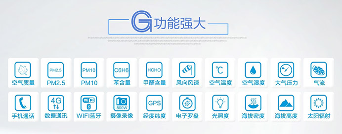可測量要素為:風速,風向,氣流,環(huán)境溫度,環(huán)境濕度,氣壓,太陽輻射,紫外線強度,風寒指數(shù),熱指數(shù),露點,海拔高度,海拔密度,位置經(jīng)度緯度,電子羅盤,時間,GPS,CO2濃度,土壤水份/溫度、雨量、熱流等(用戶可根據(jù)使用要求選配以上測量要素)。
