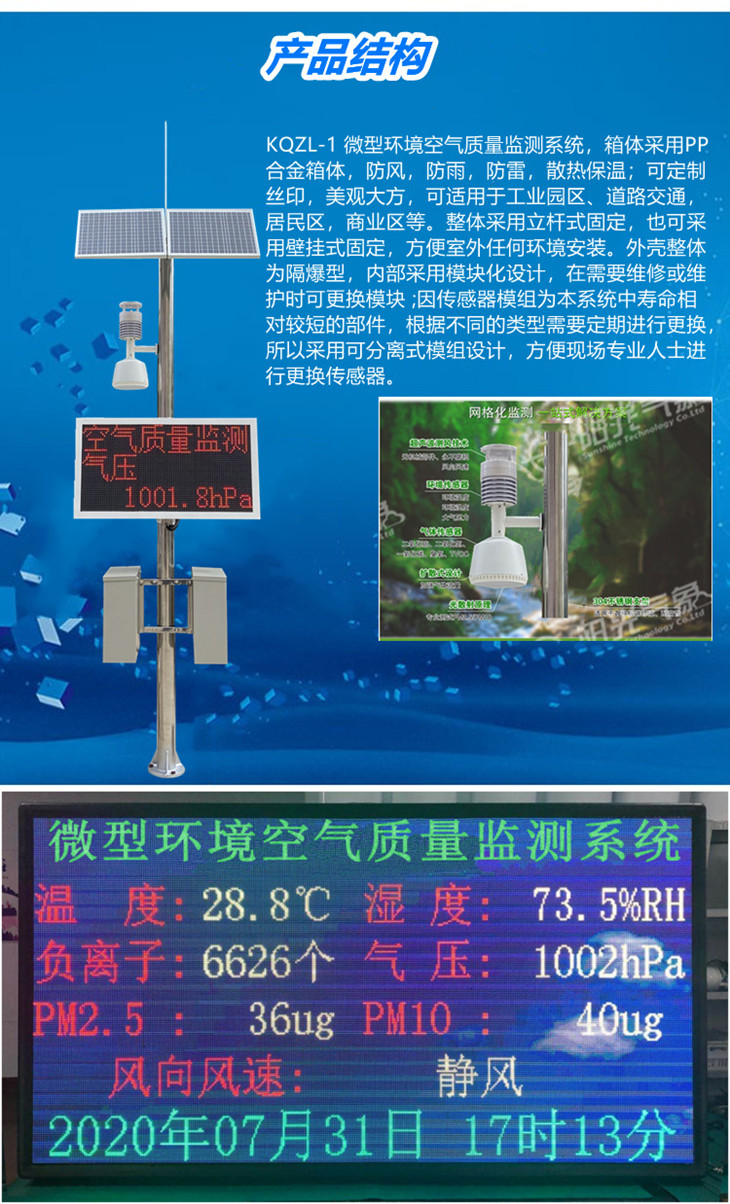 KQZL-1 微型環(huán)境空氣質(zhì)量監(jiān)測系統(tǒng),箱體采用PP合金箱體,防風(fēng),防雨,防雷,散熱保溫;可定制絲印,美觀大方,可適用于工業(yè)園區(qū)、道路交通,居民區(qū),商業(yè)區(qū)等。整體采用立桿式固定,也可采用壁掛式固定,方便室外任何環(huán)境安裝。外殼整體為隔爆型,內(nèi)部采用模塊化設(shè)計(jì),在需要維修或維護(hù)時(shí)可更換模塊 ;因傳感器模組為本系統(tǒng)中壽命相對(duì)較短的部件,根據(jù)不同的類型需要定期進(jìn)行更換,所以采用可分離式模組設(shè)計(jì),方便現(xiàn)場專業(yè)人士進(jìn)行更換傳感器。