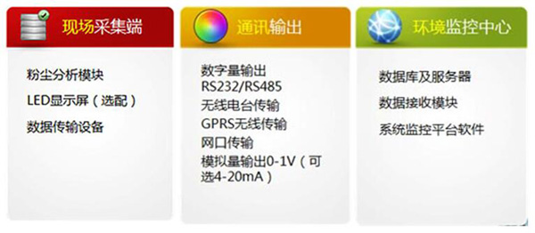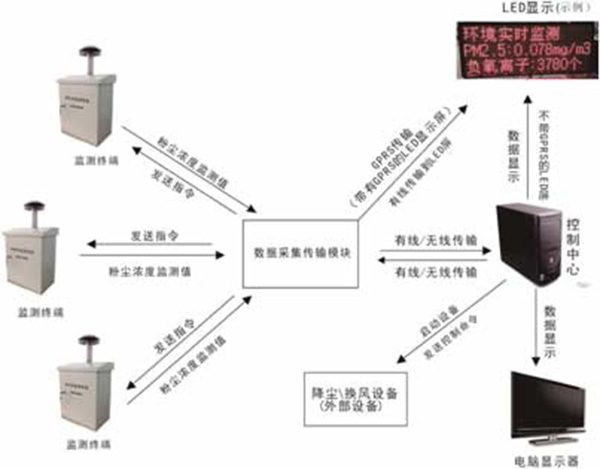 本系統(tǒng)以有線232傳輸方式為紐帶,組建現(xiàn)場(chǎng)端到監(jiān)控平臺(tái)的一個(gè)城域網(wǎng),實(shí)現(xiàn)各監(jiān)控點(diǎn)與監(jiān)控平臺(tái)的連接?,F(xiàn)場(chǎng)端設(shè)備按照國(guó)家相關(guān)技術(shù)協(xié)議將實(shí)時(shí)粉塵監(jiān)測(cè)濃度指數(shù)傳輸?shù)奖O(jiān)控平臺(tái),監(jiān)控平臺(tái)對(duì)監(jiān)控?cái)?shù)據(jù)進(jìn)行存儲(chǔ)、統(tǒng)計(jì)、分析、處理,為重點(diǎn)區(qū)域環(huán)境管理提供數(shù)據(jù)支持和決策依據(jù)。