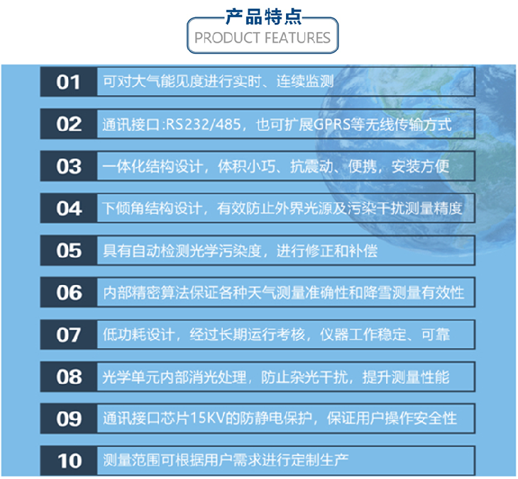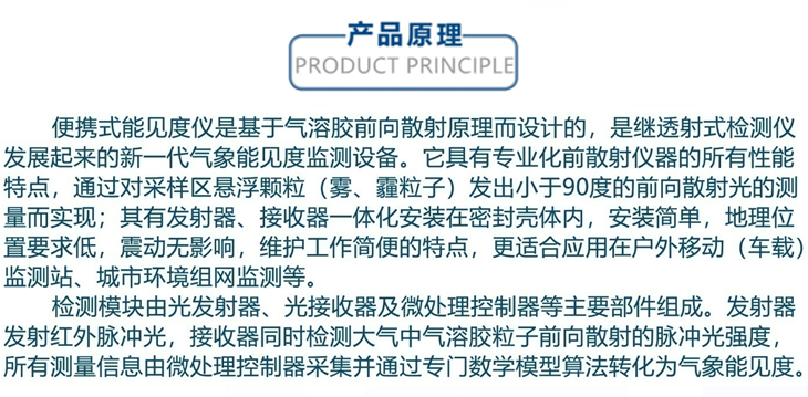 便攜式能見(jiàn)度儀是基于氣溶膠前向散射原理而設(shè)計(jì)的,是繼透射式檢測(cè)儀發(fā)展起來(lái)的新一代氣象能見(jiàn)度監(jiān)測(cè)設(shè)備。它具有專(zhuān)業(yè)化前向散射儀器的所有性能特點(diǎn),通過(guò)對(duì)采樣區(qū)懸浮顆粒發(fā)出小于90度的前向散射光的測(cè)量而實(shí)現(xiàn);設(shè)備發(fā)射器、接收器一體化安裝在密封殼體內(nèi),安裝簡(jiǎn)單,地理位置要求低,振動(dòng)無(wú)影響。