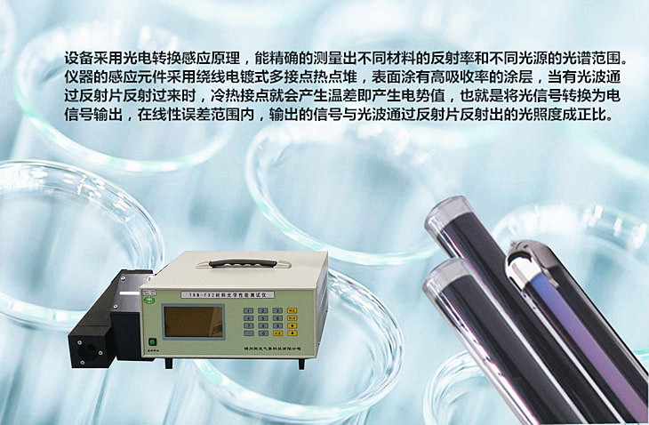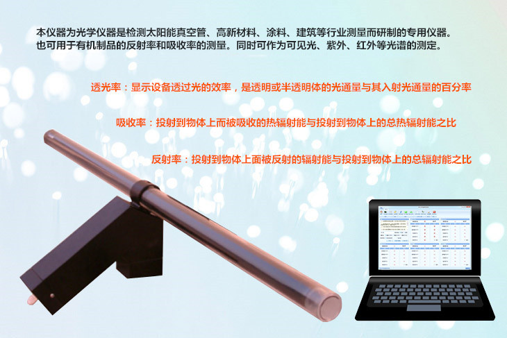 本儀器為光學(xué)儀器是檢測(cè)太陽(yáng)能真空管,太陽(yáng)能集熱器及高新材料、涂料、顏料、建筑等行業(yè)精確測(cè)量而研制的專用儀器,它可用于各種太陽(yáng)能真空管,太陽(yáng)能集熱器涂層、漆膜、油脂、簿膜、塑料制品、有機(jī)制品反射率和吸收率的測(cè)量。