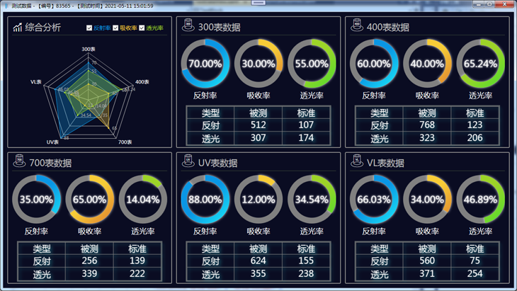 4.檢測(cè)數(shù)據(jù)自動(dòng)存儲(chǔ),實(shí)時(shí)顯示測(cè)試結(jié)果,自動(dòng)計(jì)算并繪制反射率,吸收率,透光率曲線圖。