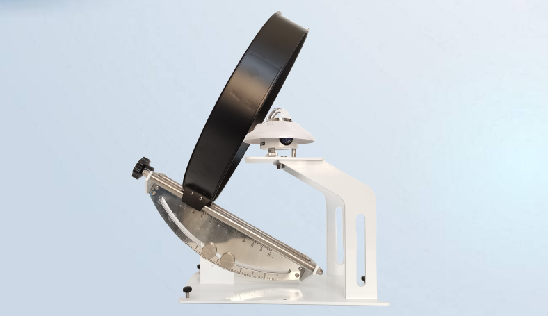 本裝置設(shè)有寬度為65mm,直徑為400mm的遮光環(huán)圈,固定在刻有緯度刻度與赤緯刻度標尺的絲桿調(diào)整螺旋上。標尺與支架固定在底盤上,根據(jù)架射地點的地理緯度而固定??傒椛浔戆惭b在支架平臺上,其高度應(yīng)正好使輻射感應(yīng)平面(黑體)位于遮光環(huán)中心。通過調(diào)節(jié)赤緯度,可使遮光環(huán)全天遮住太陽的直接輻射。