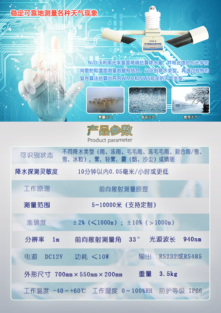 NJD-6型天氣現(xiàn)象能見(jiàn)度傳感器是錦州陽(yáng)光自主研發(fā)的國(guó)產(chǎn)化高精度天氣現(xiàn)象探測(cè)設(shè)備,可以識(shí)別各種雨及雪的狀態(tài),超越了傳統(tǒng)的雨量?jī)x器,滿(mǎn)足對(duì)雨雪的精密觀測(cè),同時(shí)又可以實(shí)時(shí)監(jiān)測(cè)能見(jiàn)度的數(shù)據(jù)。